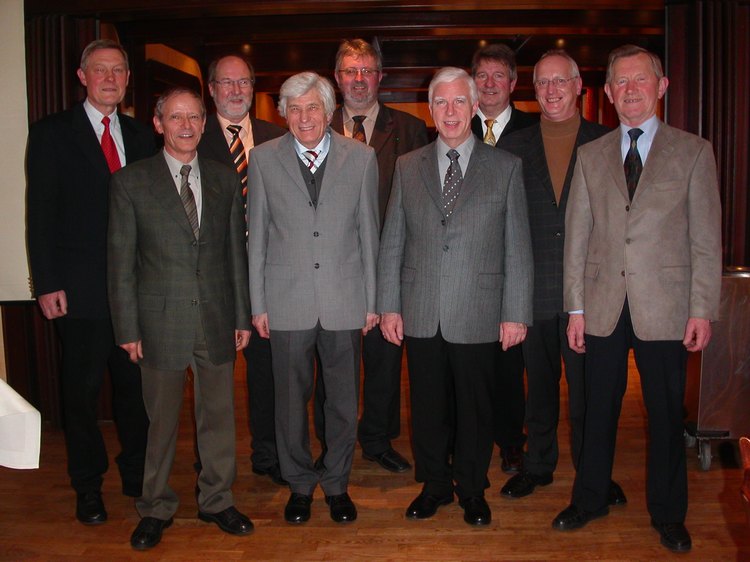 2. Kassierer Peter Schöneweis, der neu gewählte Notenwart Franz-Josef Stoiber, 2. Vorsitzender Gottfried Neuhaus, Chorleiter Alfons Puscher, Vorsitzender Norbert Stollmeier, 1. Kassierer Willi Wibbeke, Gestaltungsfachmann Ulrich Leifeld, Schriftführer Rudolf Heinemann und Notenwart Adolf Drewniok